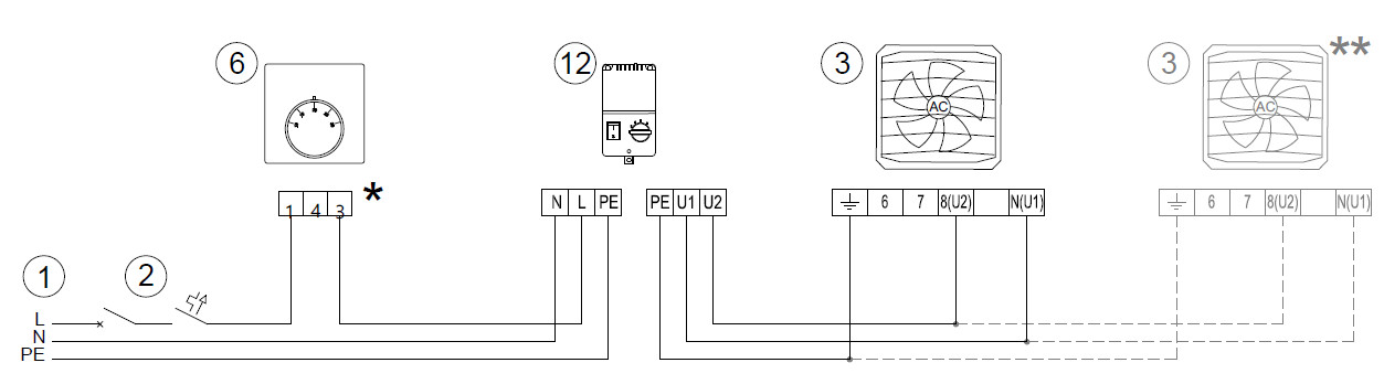 schemat ze przełącznikiem 5-biegowym (12) i termostatem uniwersalnym jako opcją (6)