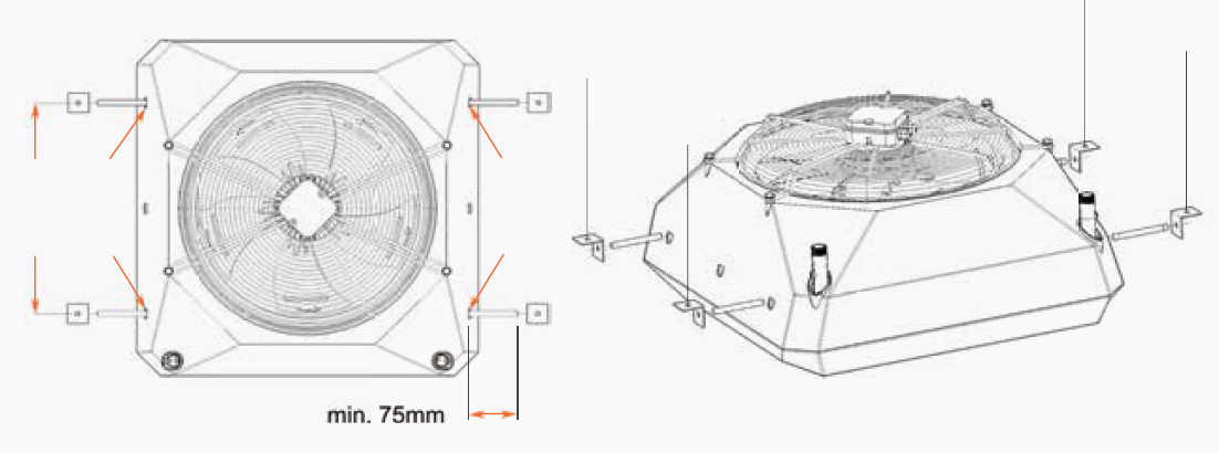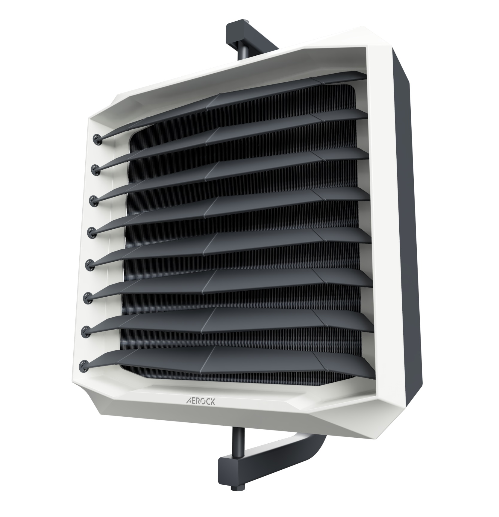 Nagrzewnice wodne przemysłowe AEROCK można montować do ściany lub stropu za pośrednictwem kątowo-obrotowej konsoli montażowej (w komplecie) lub przez podwieszenie do stropu na prętach gwintowanych (tzw szpilkach).