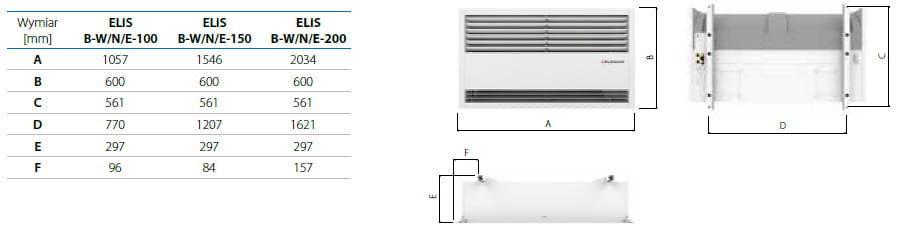 Kurtyna powietrzna ELIS B-E-200 wyposażona jest w 3-biegowe wentylatory nadmuchowe oraz samoregulujące się grzałki elektryczne mocy 15kW typu PTC.