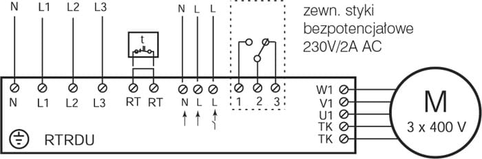 Obwód zabezpieczenia działa po podłączeniu czujnika TK wentylatora (jeśli jest w takowy wyposażony) do odpowiednich zacisków regulatora RTRDU.