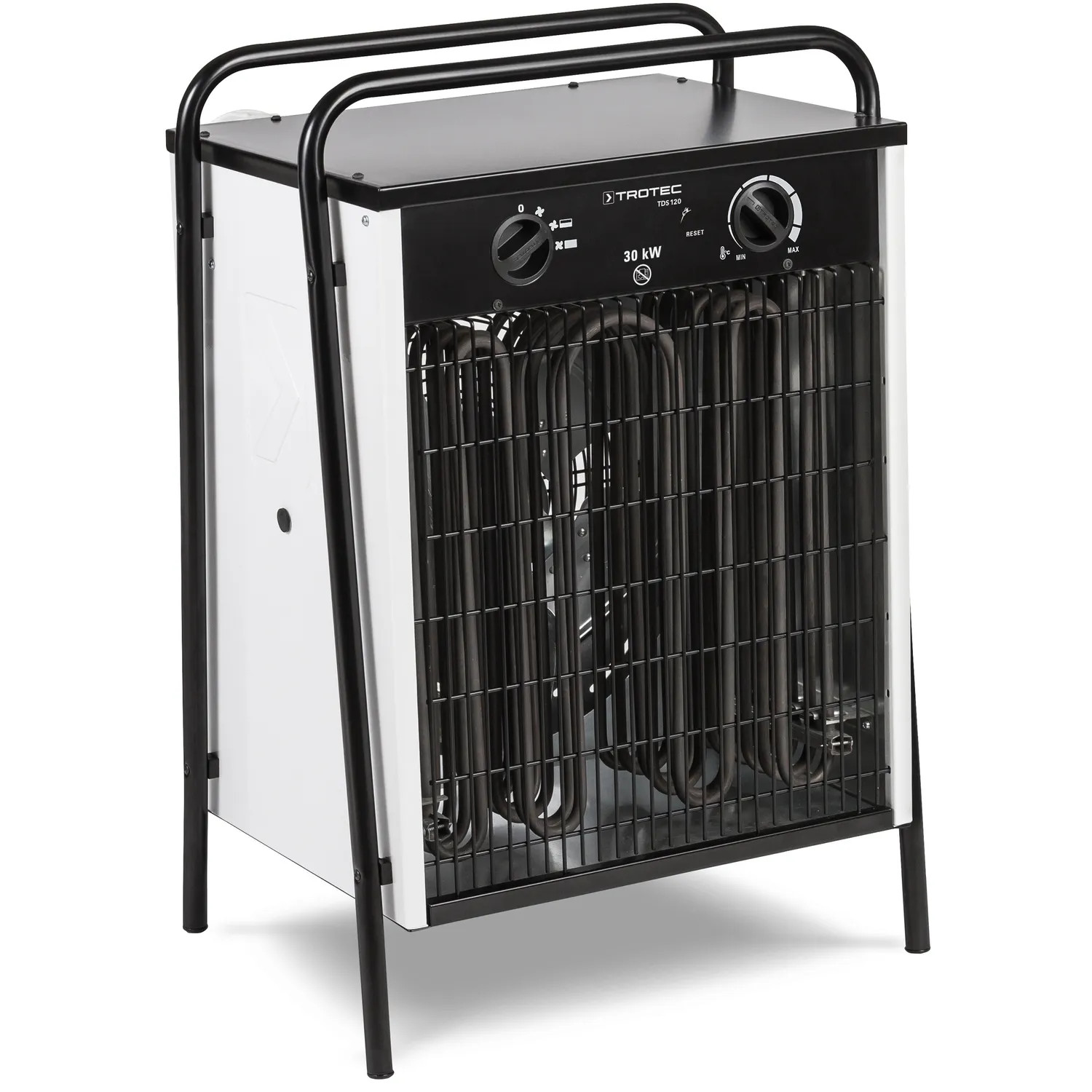 Nagrzewnica elektryczna przenośna podłogowa TDS 120 niemieckiej marki TROTEC do ogrzewania magazynów, hal przemysłowych, warsztatów, pomieszczeń gospodarczych, garaży, kontenerów, pomieszczeń remontowanych i na budowach.